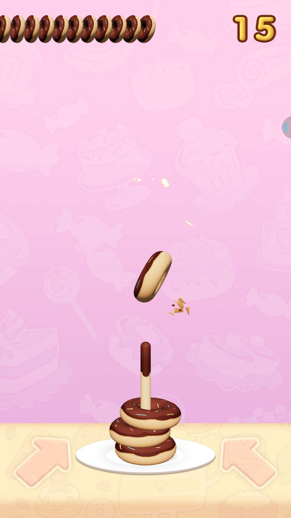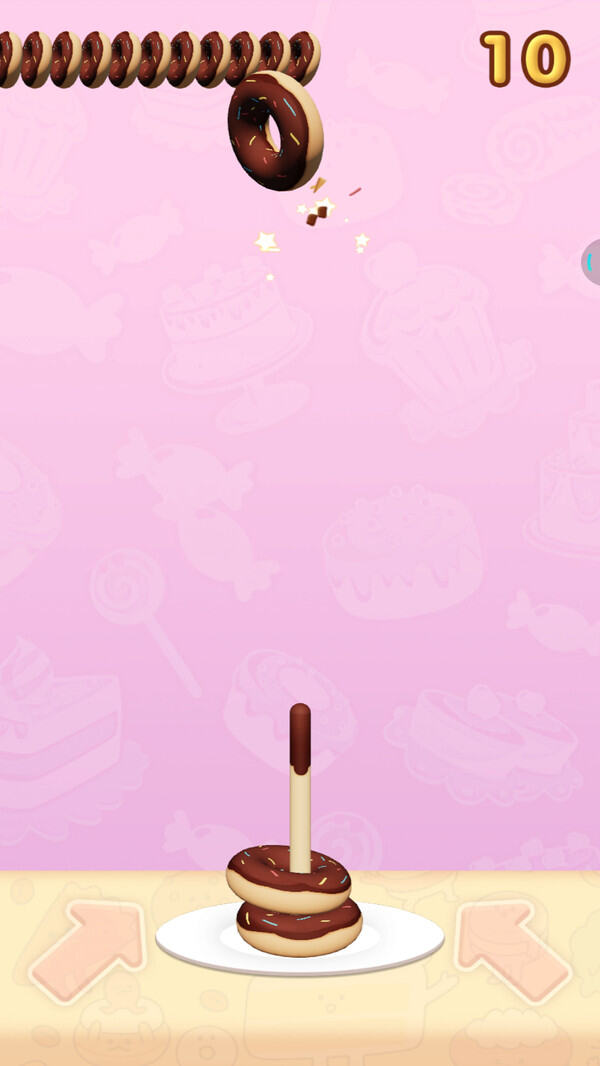 玩家通过点击左右两个按钮来控制甜甜圈的移动,注意甜甜圈掉落会直接损坏。