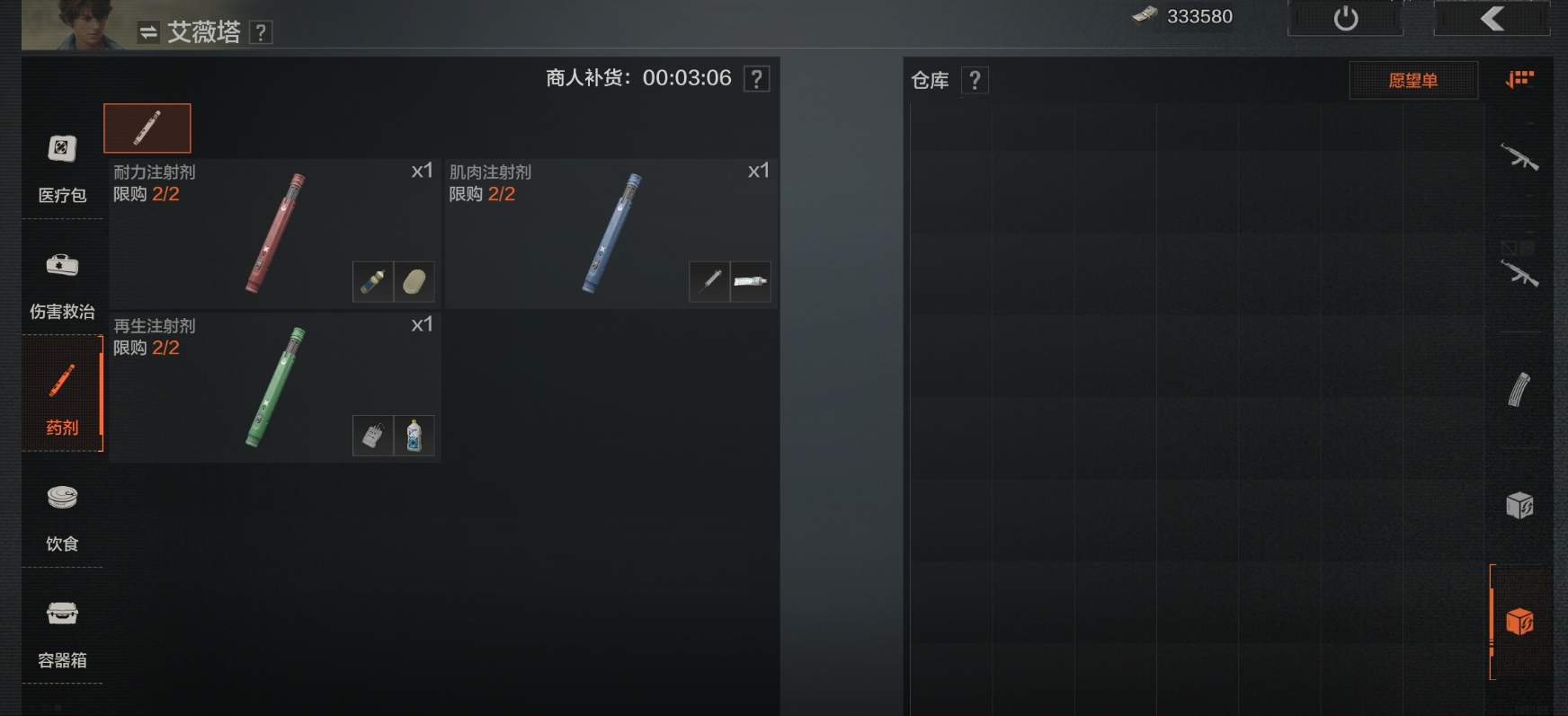 接下来我们聊聊另一个很早期就能解锁的联络人艾薇塔。在设定中,艾薇塔曾是医学院的高材生,为了寻找父亲结识了乔尔·加里森并成为了他的医疗人员,这也是为什么她出售的商品主要是医疗用品和补给品。
