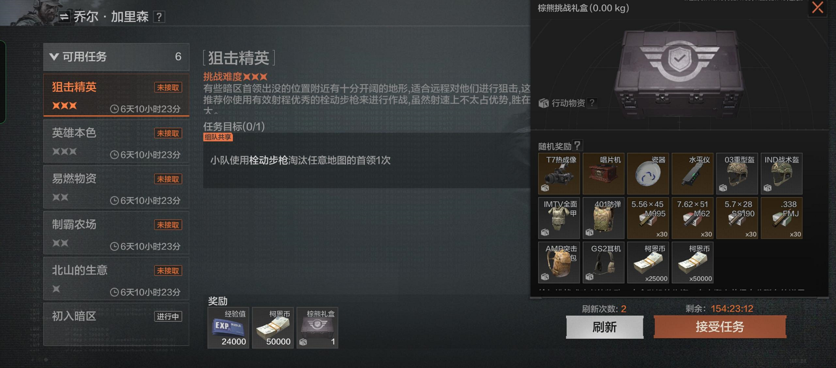除此之外他还会每周一发布5个难度不一的周常任务,完成这些任务可以获得柯恩币以及能开出高价值物品的礼盒。如果某些任务对于先锋来说较难,也可以通过每周2次的任务刷新次数来获取新的任务。