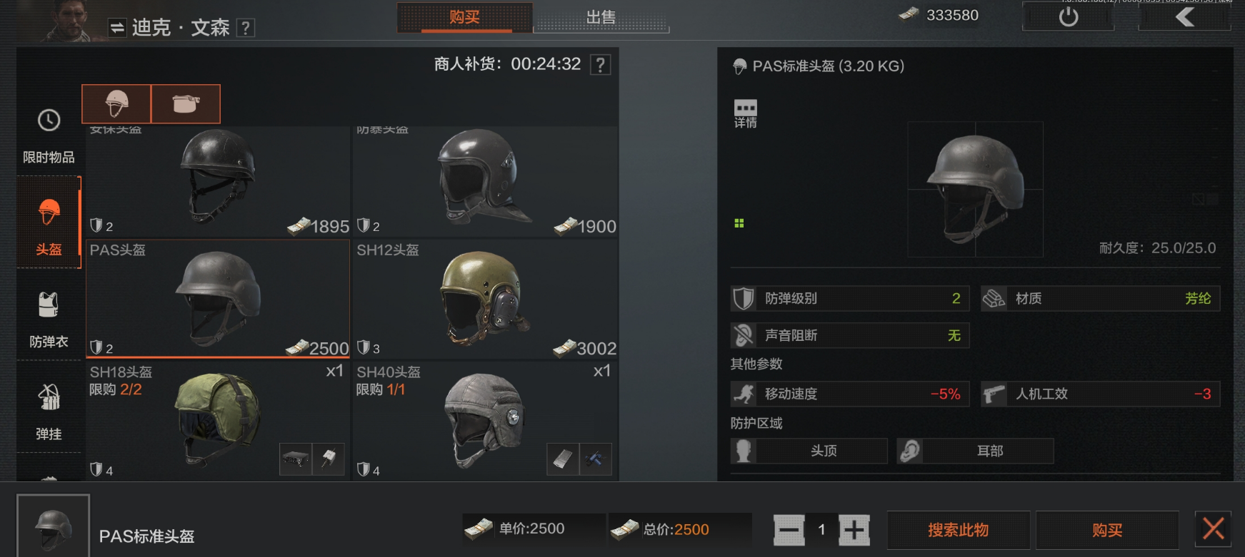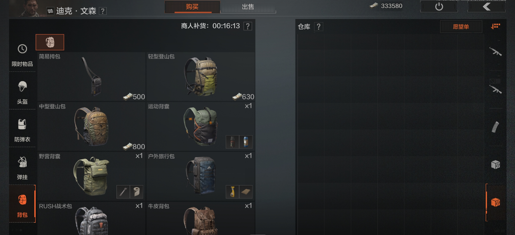 迪克·文森售卖的物品中,比较有特色的有两类,其一是各种容量不等的背包和弹挂,其中中型登山包和BH弹挂是前期性价比很高的选择,只需花点柯恩币就可入手;另一类则是防具,在迪克·文森这里能买到不同等级的头盔和防弹衣,前期如果失手成盒,不妨来这里看看能不能花点小钱再凑出一套装备。