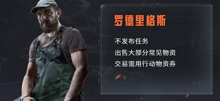 最后一位是比较特殊的联络人罗德里格斯,他会在先锋解锁赛季任务系统后开放。罗德里格斯不会为你派发联络人任务。他售卖的商品需要消耗的不是柯恩币,而是你从赛季奖励手册中获得的行动物资券。一般来说,兑换大包、弹挂或4级头甲是比较常见的选择,当然大家也可以根据自己的需求兑换武器或者消耗品,不过性价比可能不如弹挂和背包高。
