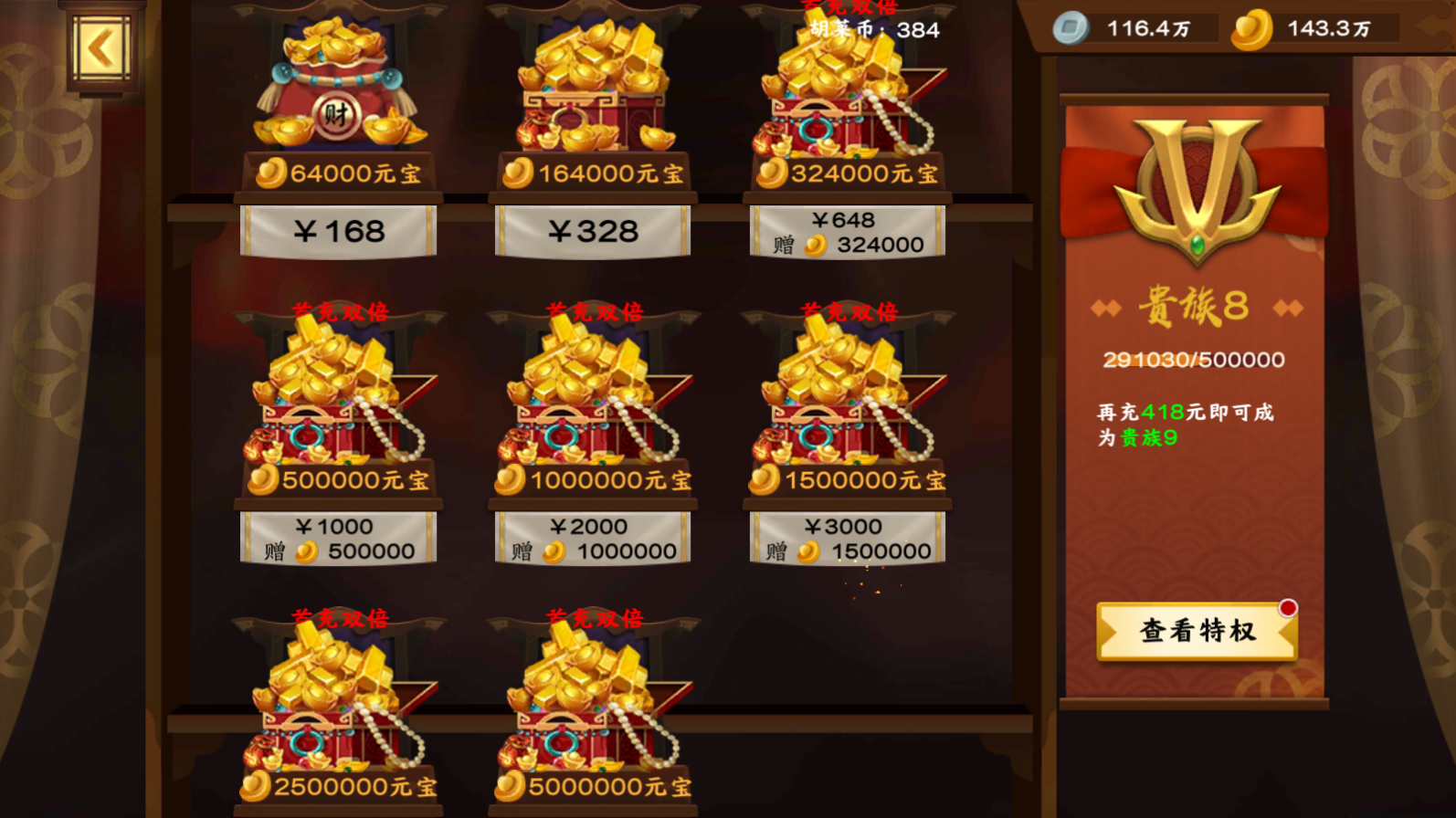 ★玩家拥有100个【胡莱币】,则可以自由充值30、698元等档位,但是不能支付128元