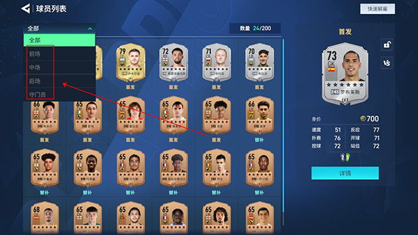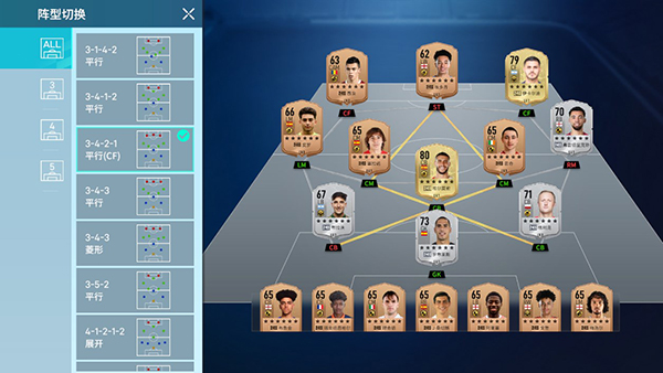 游戏内球员有着丰富的阵型可以切换,切换后可以重新评分,评分越高阵容强度就越高。