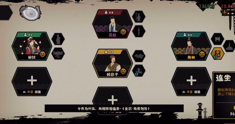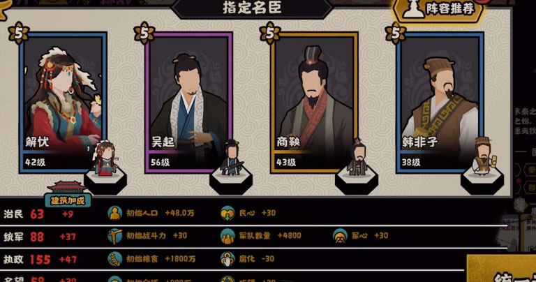 游戏结束,系统会根据你的【文政】【武功】【民治】三个方面来进行评分,此外还有一个【额外得分】标准:名臣巡访获得的藏品可增加额外得分,不同的结局能获得不同的额外得分,统一天下结局获得的额外得分最高。