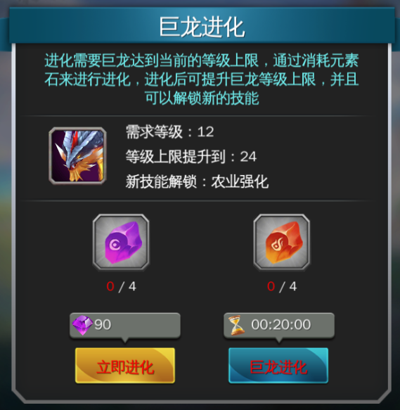 除了升级,攻城兽还能进化。进化要求攻城兽达到其当前品质的等级上限,然后通过消耗【元素石】来进行。进化后,攻城兽的品质将 上升 ,并且等级上限也会提升。此外,进化还会解锁新技能,为玩家提供更多的增益效果。同样的【元素石】也可以在开启【巨龙秘宝】时获得。因此,如果玩家希望攻城兽变得更强,就需要尽量多地合成【巨龙秘宝】。