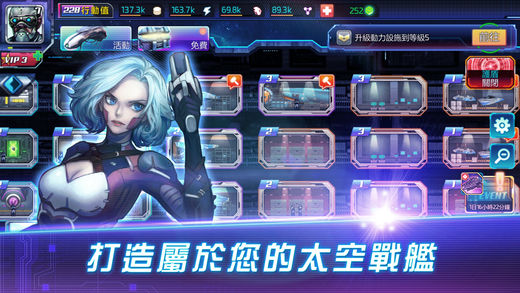 - 万千星系之中找寻各种战舰蓝图,开发各具特色的战舰为您护航;不同战舰搭载各样武器装备,激光炮台、离子光束炮、特殊导弹、能量护盾等等,一一协助您在战斗中所向披靡.