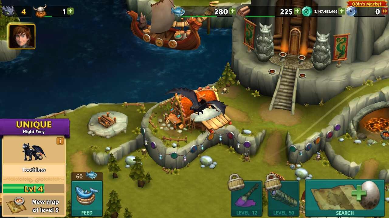 游戏里龙是主要收集材料的途径,所以要大量收集鱼、和木材,必先要有龙,那么要如何获得龙?游戏一开始就配给了可爱的无牙(Toothless),无牙是负责寻找龙蛋的,根据无牙的等级,可以找的蛋的种类也会逐渐增加。找来的龙蛋放到孵化炉处孵化,就可得到相应的龙。不过无牙不是每次都能带回龙蛋的,有时候是木材,有时候是鱼。