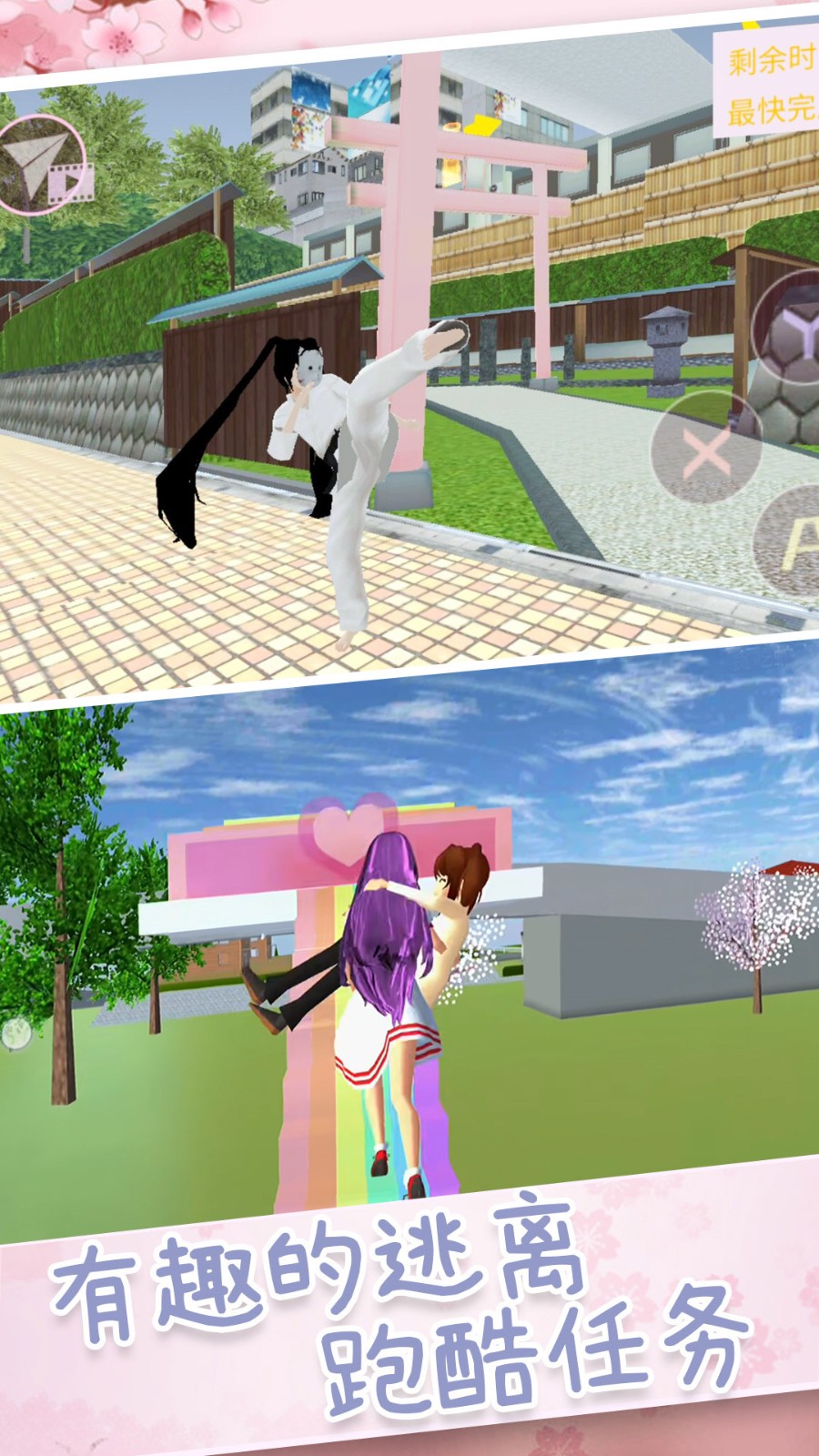 这款游戏提供简单的跑酷挑战,玩家可以在樱花校园里自由玩耍,探索众多场景,避开陷阱和机关,操控角色完成更多任务,顺利通过所有难关,寻找校园中隐藏的宝藏!