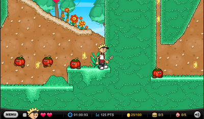 1,游戏的玩法轻松有趣,考验玩家的操作,在前几关,玩家的没有武器,需要灵活跳跃躲避食物敌人,完成关卡挑战。