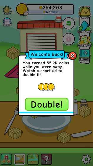 食物的进化,玩家在游戏中体验简单的经营玩法,玩家不需要什么复杂的美食制作玩法,轻松的点击完成各种游戏内容,收集各种食物,用合成相同食物的方式来升级获得新的食物,没有各种复杂的制作,合成升级,最终取得商业成功,玩家可以看到食物的进化史,用食物硬币购买新的食物。