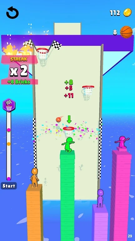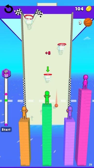 篮球塔比赛是一款非常有趣的休闲闯关游戏。玩家需要通过投篮得分,关卡内会随机出现篮筐,谁先投中即可上升一个台阶,最先到达顶层的玩家就能获胜。游戏采用了创新的投篮对决模式,让玩家与其他对手一决高下,有效提升了玩家的反应速度和投篮准确度,极具挑战性。此外,游戏精美的画面和愉快的背景音乐也为玩家提供了更佳的游戏享受。