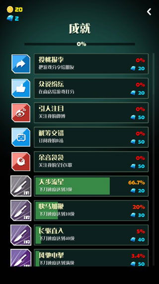 同时培养升级飞刀的速度、数量和冷却时间也是让你更好的实现切换的关键,收集金币、钻石,解锁更多的飞刀皮肤,赋予游戏更多的乐趣。