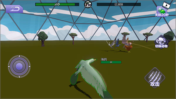下载安装好游戏,进入游戏,使用左边的轮盘来控制角色移动,点击右边的按钮进行攻击,点击右侧的切换动物可以控制其他动物进行游戏。将场上除你之外的所有敌人消灭即可获取胜利。