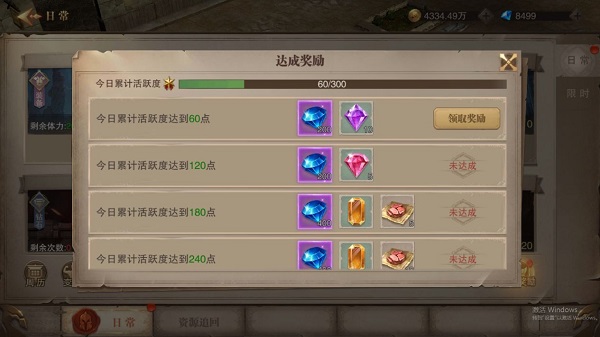 八、完成日常任务累计活跃度,领取丰富奖励,包含钻石,日常按钮在游戏的右上角。