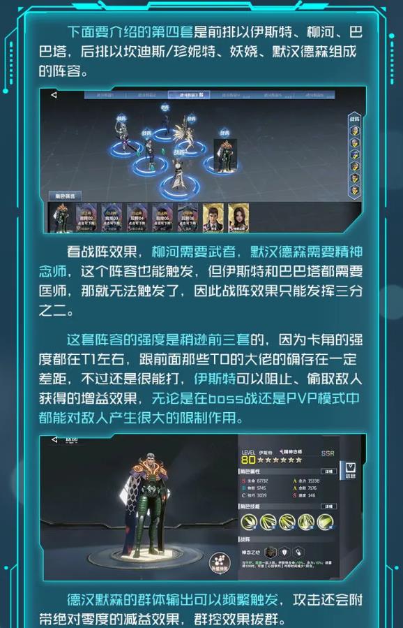 这套阵容能触发全员的战阵效果,从配置来看是非常完美的,徐欣/维妮娜作为医师,前者的回血与后者的无敌都能为队友强大的保护,而诸葛韬作为守护职业,卡角特性是血量每减少10%,力量和物防都会相应提高,可谓越残血越肉,巴巴塔作为当前强力的精神念师,可以为队友回能量、加盾、驱散敌人的增益状态,适用于各种阵容,雷神则是在自身和队友攻击后都有50%概率进行追击,持续输出能力门很强,井拥有目前游戏中输出很高的群体技能,输出还会平分给所有敌方角色。