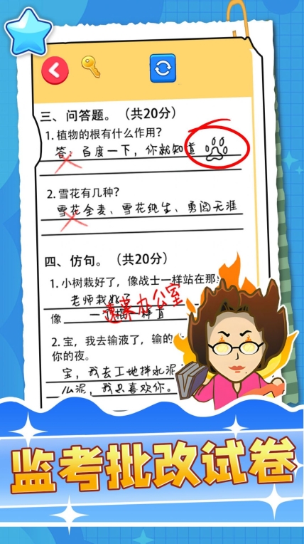 监考批改试卷游戏拥有别具一格的答题闯关玩法,其画风独特,闯关过程轻松又益智。游戏中题目类型丰富多样,能让你轻松打发无聊时光,同时展现你非凡的闯关技巧,为大家带来超多欢乐。