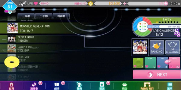 游戏主界面,其中画黄圈的部分就是活动歌曲选项,点击即可进入活动界面。