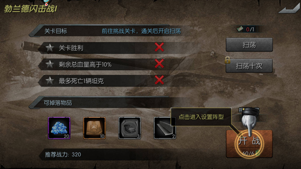 根据新手引导进入战斗指引,选择第一个关卡,选择好坦克,最后进入战斗