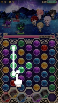 游戏的所有角色是带有属性(颜色)的,消除对应的颜色的球就可以触发该颜色角色的攻击,消除的越多,攻击越大。一次至少需要消除3个才能产生消除判定,一次行动回合有10秒的消除时间,一下子消除6个相同颜色的球会产生一个爆弹,可以造成相邻位置的爆炸消除。