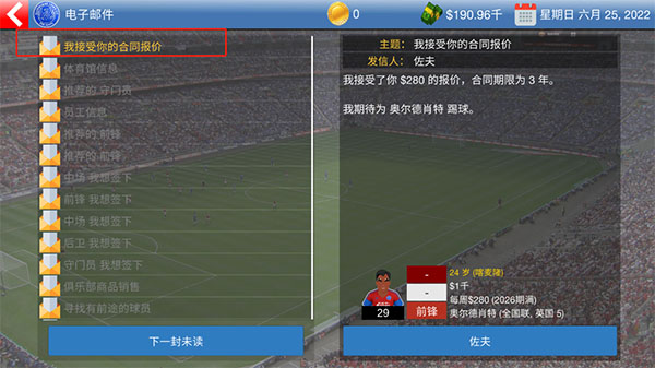 最后到收件箱中查看,若球员接受报价,即表明购买成功。