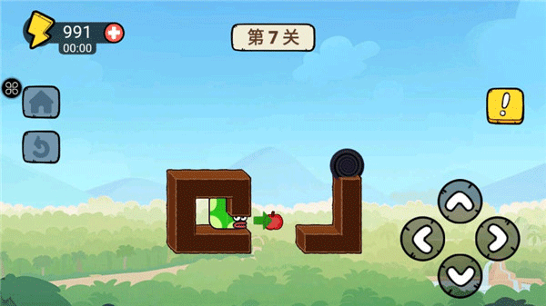 这个阶段的挑战性增加了,首先向右移动,但不要立即去吃苹果,而是继续前进到右侧,接着转向上,再向左找到苹果,从左侧绕过障碍物,向上攀爬,最终从顶部到达终点。