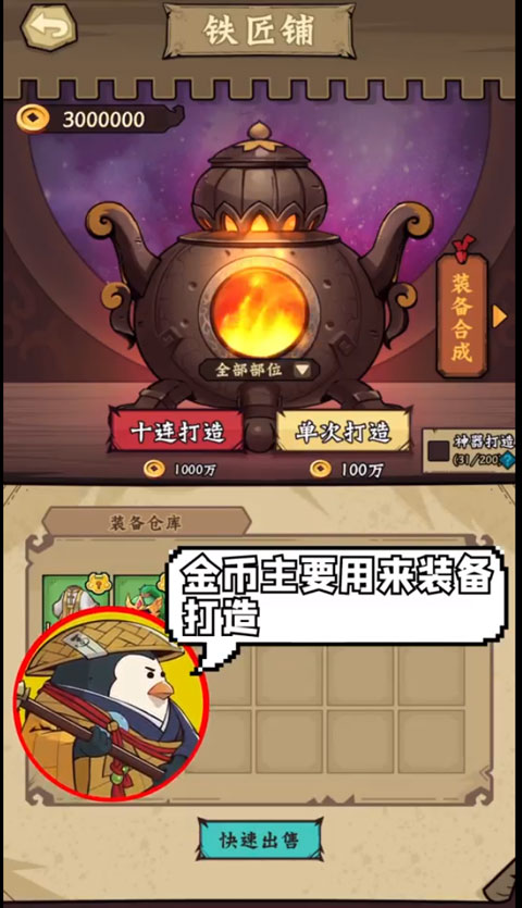 金币主要用于装备的制作和合成。在游戏初期,我们推荐玩家优先使用金币来打造三套装备:基础属性套装、自动打怪金币增加套装以及通关金币增加套装。一旦这些装备齐全,即使金币耗尽也不必担心,因为积累的金币可以用于提升武学技能。