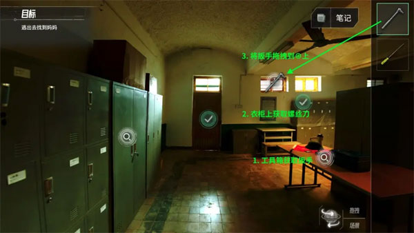第二步:在游戏《逃离更衣室》的探索环节中,从工具箱里取出“扳手”,接着在衣柜上找到“螺丝刀”,之后将扳手拖动至窗户旁的⊕标记处。
