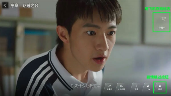 然后点击“跳过”剧情,直到右上角出现“纸飞机”存档图标: