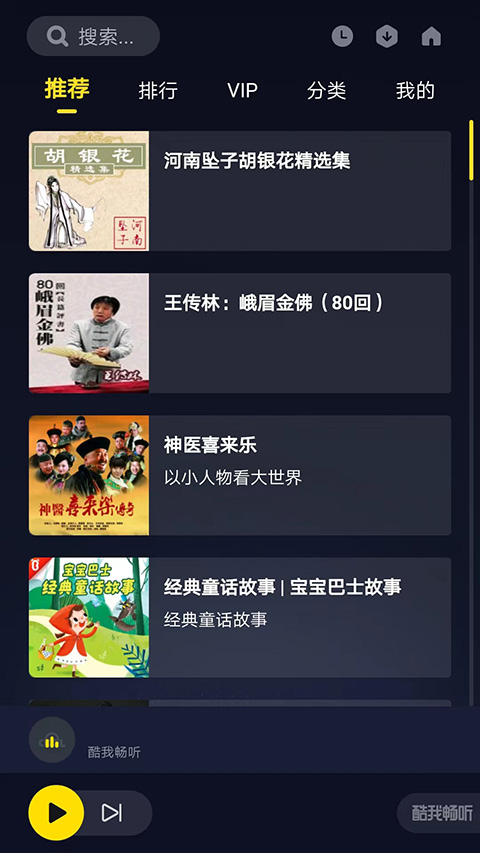 打开酷我畅听车机版最新版,进入应用主界面,可看到包括【推荐】、【排行】、【VIP】、【分类】和【我的】栏目,