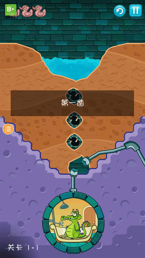 三只小鸭冲刺——不需要摆弄泥浆、毒水,只需要让水直接滚到右边的断管里!注意鸭子!溢水奖励不是关键!
